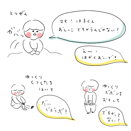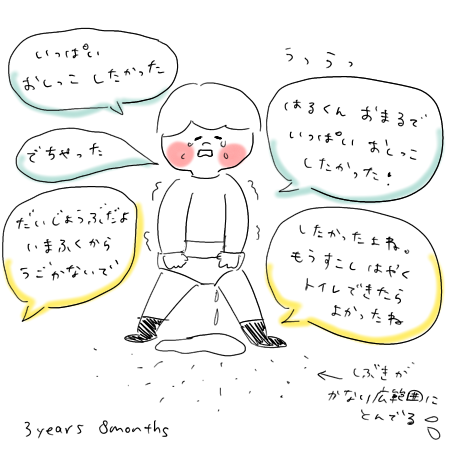 おしっこをがまんする 2020年11月29日2020年11月29日nukumoru 0 寒い朝によくあるパターン❄️ 人は同じ失敗を繰り返して大きくなるんだなぁ。 だから言ってるじゃん!泣きたいのはこっちだよ! と言いたいところだけど 自分が悪かったと分かっていながら素直に泣きじゃくる姿は ぎゅーっと抱きしめたくなります